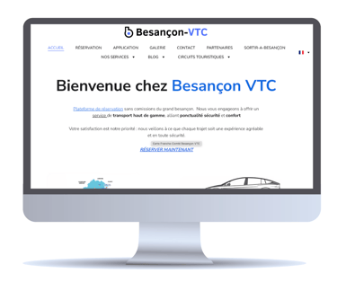 Besançon-VTC a su se démarquer grâce à une identité visuelle forte et à un site web optimisé. Aujourd’hui, Besançon-VTC est le premier résultat de site web sur Google lorsqu’un client recherche un chauffeur VTC à Besançon.